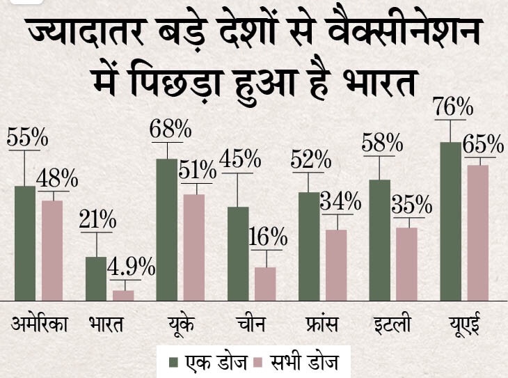 दुनिया के सबसे बड़े वैक्सीनेशन अभियान के दावे के बावजूद भारत में शुक्रवार (9 जुलाई) तक केवल 4.9 आबादी को कोरोना की दोनों डोज लग सकी हैं। वहीं 21% लोगों को वैक्सीन की एक डोज लगी है। दूसरी ओर अमेरिका में 55% आबादी को एक डोज और 48% लोग पूरी तरह वैक्सीनेट हो चुके हैं।