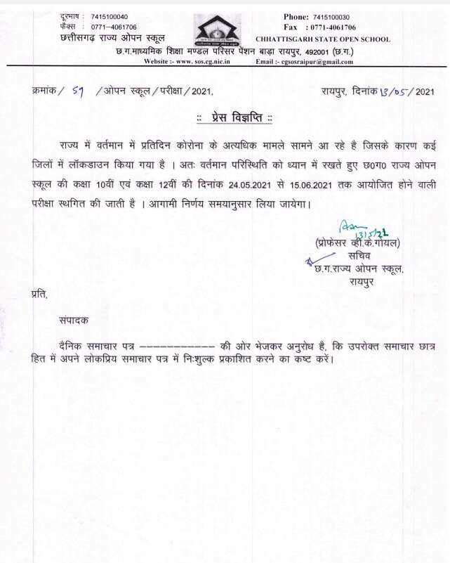 राज्य ओपन स्कूल एवं माध्यमिक शिक्षा मंडल के सचिव वीके गोयल ने बताया कि राज्य में वर्तमान समय प्रतिदिन कोरोना के अत्याधिक मामला सामने आ रहे हैं. जिसके कारण कई ज़िलों में लॉकडाउन किया गया है. इस परिस्थिति को देखते हुए छत्तीसगढ़ राज्य ओपन स्कूल के कक्षा दसवीं एवं बारहवीं के दिनांक 24-05-21 से 15-6-21 तक आयोजित होने वाली परीक्षा आगामी आदेश तक स्थगित कर दी गई है.