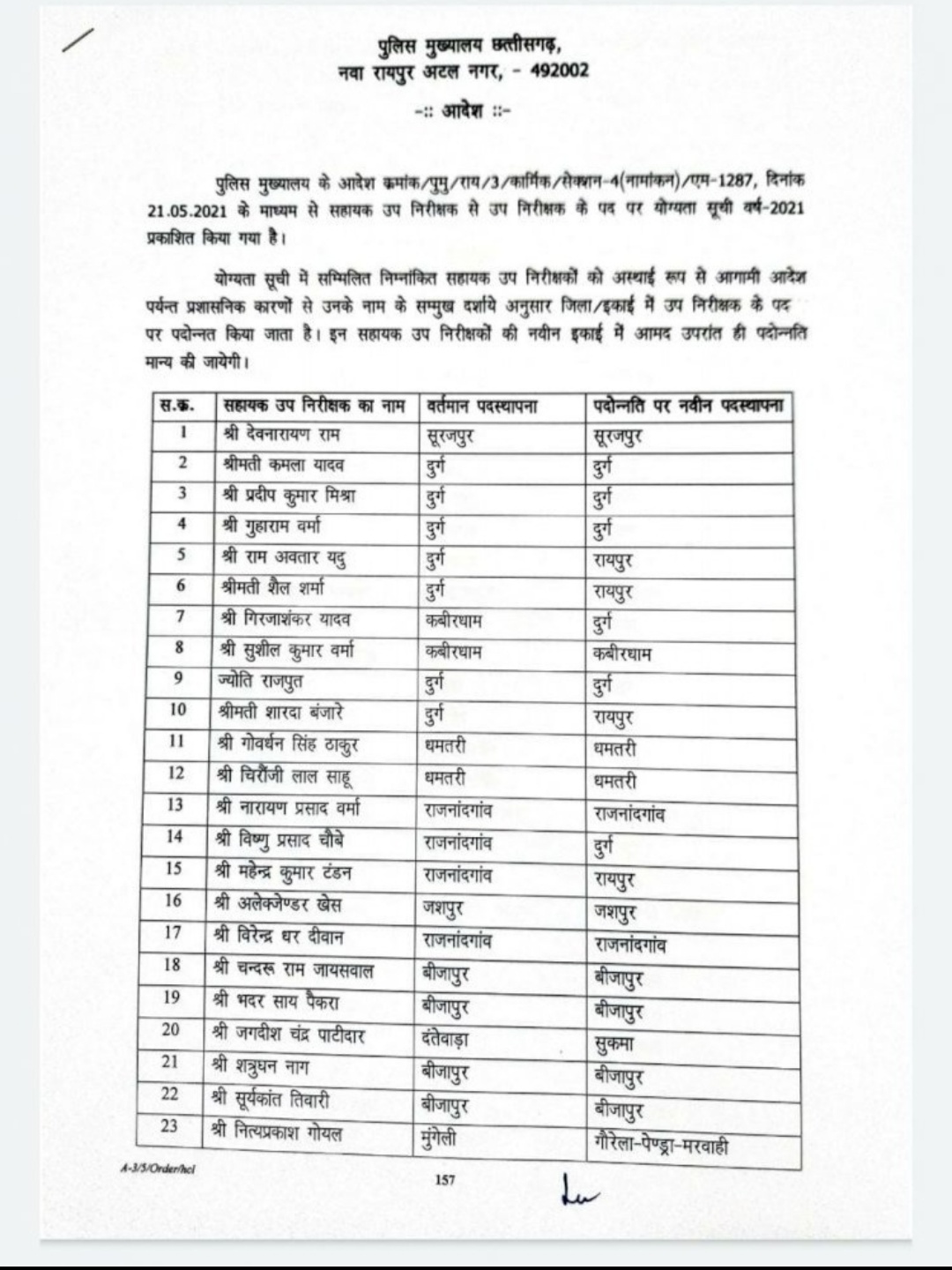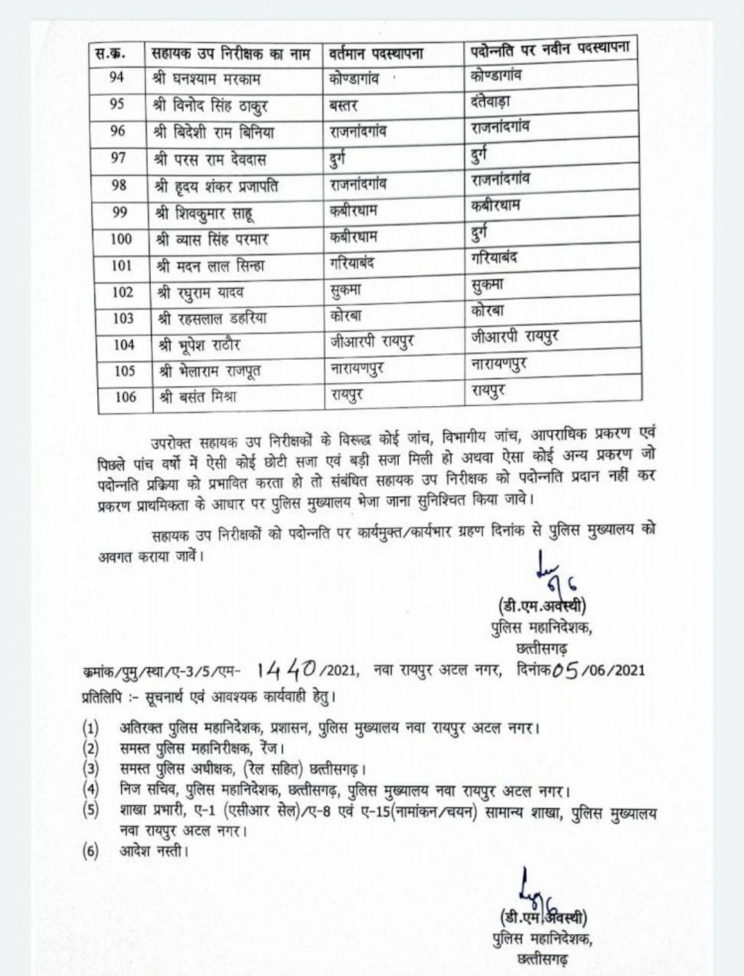 रायपुर। डीजीपी डीएम अवस्थी ने आज सहायक उप निरीक्षकों (एएसआई) की पदोन्नति सूची जारी की है. जारी सूची में कुल 106 एएसआई को पदोन्नत कर एसआई बनाया गया है. जो इस प्रकार है- देखिए सूची-