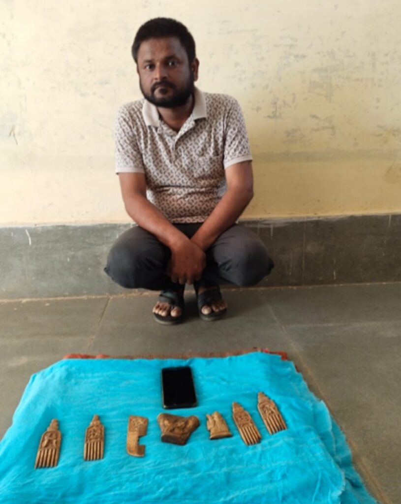 जिसपर पुलिस टीम युवक की तलाशी ली तो उनके पास 07 नग हाथी दांत हाथी दांत पर नक्काशी की हुई बेशकीमती नायाब कलाकृती रखे मिला। जिसके संबंध में पूछताछ कर हाथी दांत पर नक्काशी की हुई बेशकीमती नायाब कलाकृती रखने व उसे बेचने का वैधानिक दस्तावेज प्रस्तुत करने कहा गया है। जिनके पास कोई वैधानिक दस्तावेज नही होने पर आरोपी सोनू मित्तल को मौके पर गिरफ्तार कर उनके कब्जे से कुल 07 नग वन्य प्राणी हाथी के दांत से बने हाथी दांत पर नक्काशी की हुई बेशकीमती नायाब कलाकृती जैसे ट्राफी कीमती 5,12,000 रूपये, जिसमें किसी रजवाड़े या मंदिरों में नकाशी के प्रयोग में लाये जाने वाली कलाकृति के नमुने बने को जप्त किया गया।