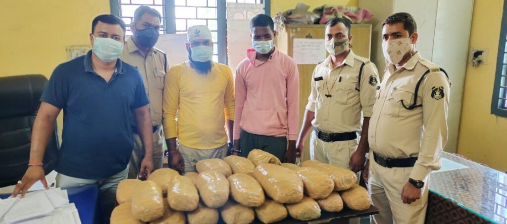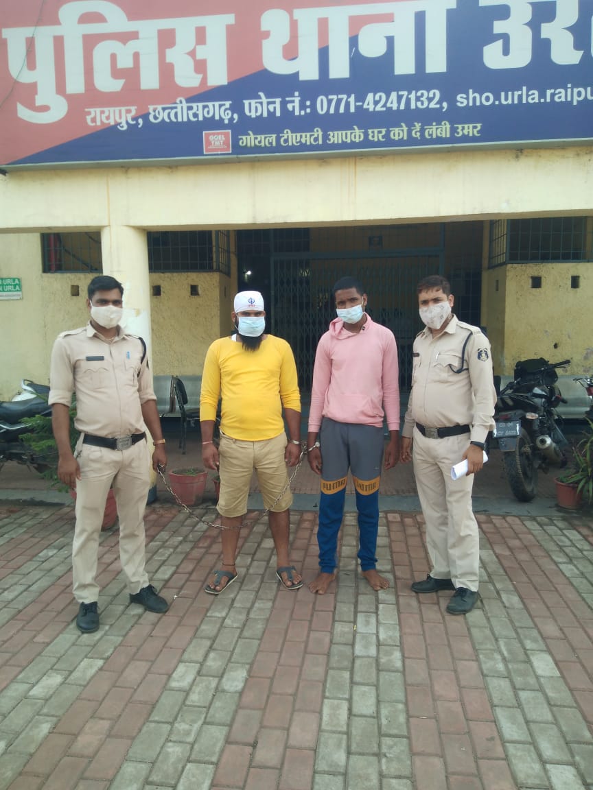 जिन्हें घेरा बंदी कर पकड़ा गया नाम पूछने पर जितेंद्र सिंह बग्गा पिता परमजीत सिंह बग्गा उम्र 30 साल पंजाबी पारा वार्ड नंबर 11 खरियार रोड थाना चौक जिला नुआपादा उड़ीसा एवं करण ठाकुर उर्फ विशाल पिता राम ठाकुर उम्र 21 साल अवंती विहार कॉलोनी वार्ड नंबर 54 राघव का मकान थाना तेलीबांधा जिला रायपुर का रहने वाला बताएं आरोपी जितेंद्र सिंह के कब्जे से 7 पैकेट कुल 7 किलोग्राम एवं आरोपी करण ठाकुर उर्फ विशाल कब्जे के 21 पैकेट कुल 21 किलोग्राम कुल जुमला 28 किलोग्राम क़ीमती 2 लाख 80 हज़ार समक्ष गवाह के जप्त किया गया आरोपियों का कृत्य अपराध धारा 20/(b )एनडीपीएस एक्ट का पाए जाने से थाना उरला रायपुर में अपराध क्रमांक 230/21 धारा 20b एनडीपीएस एक्ट का अपराध पाए जाने से आरोपियों को आज दिनांक 13/7/ 21 को गिरफ्तार किया गया आरोपियों के परिजनों को मोबाइल के जरिए से गिरफ्तारी की सूचना दी गई न्यायिक रिमांड पर कोर्ट रवाना किया गया है।