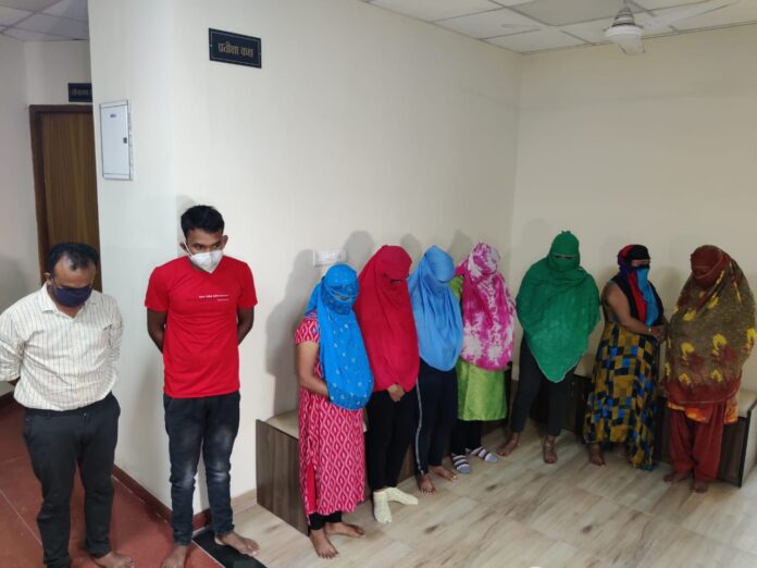 राजधानी रायपुर थाना गंज व कोतवाली क्षेत्र में देह व्यापार करते महिलाओं व पुरूषों सहित कुल 14 गिरफ्तार विवरण – दिनांक 12.07.21 को मुखबीर से सूचना प्राप्त हुई कि थाना गंज क्षेत्रांतर्गत सत्कार गली स्थित होटल सांई राम तथा थाना कोतवाली क्षेत्रांतर्गत टैगोर नगर स्थित महावीर प्लाजा अपार्टमेंट स्थित एक मकान में अनैतिक देह व्यापार संचालित किया जा रहा है। सूचना पर अतिरिक्त पुलिस अधीक्षक शहर श्री लखन पटले के निर्देशन में नगर पुलिस अधीक्षक कोतवाली श्री आंजनेय वाश्णेय (भा.पु.से.) तथा थाना गंज व थाना कोतवाली की टीम द्वारा उक्त स्थानों पर पुलिस के प्वाइंटर को भेजकर रेड कार्यवाही करते हुये महावीर प्लाजा अपार्टमेंट टैगोर नगर कोतवाली के मकान से 07 महिलाए (02 महिला वेस्ट बंगाल एवं 05 महिला रायपुर निवासी) एवं 02 पुरूष तथा होटल सांई राम गंज से 04 महिलाए (01 महिला मुंगेली, 01 महिला गरियाबंद, 01 महिला वेस्ट बंगाल एवं 01 महिला उडीसा निवासी)