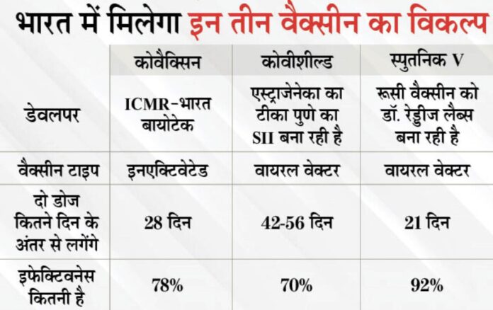 खबरों के मुताबिक यह तीनों ही वैक्सीन भारत के कोरोना के खिलाफ टीकाकरण अभियान में शामिल होंगी। वैसे भी कोवीशील्ड और कोवैक्सिन तो 16 जनवरी से ही इस्तेमाल हो रही है। अच्छी बात यह है कि तीनों ही वैक्सीन कोरोना के गंभीर लक्षणों से बचाने और मौत टालने में 100% इफेक्टिव हैं। इसी वजह से दुनियाभर के वैज्ञानिक कह रहे हैं कि जो भी वैक्सीन उपलब्ध हो, उसका डोज लगवा लें। यह आपकी जान बचाने के लिए जरूरी है। पर फिर भी तीनों वैक्सीन के बारे में यह जानकारी आपको होना चाहिए…